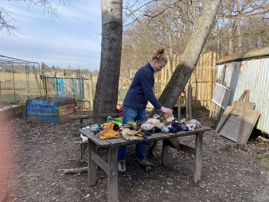 Leon Scheele`s Lieblingsplatz ist an der Gitarre, er pflegt aber auch den Hüttenbau-Bereich und sortiert dafür auch manchmal die Arbeitshandschuhe.